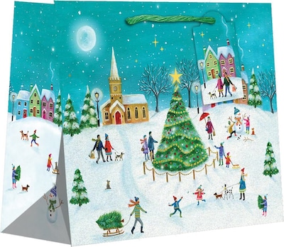 JAM PAPER Medium Design Bags measure 10" x 8" x 4". These bags feature a "Christmas Village" design and are sold in a pack of 120. Perfect for any medium sized gifts this time of year.
