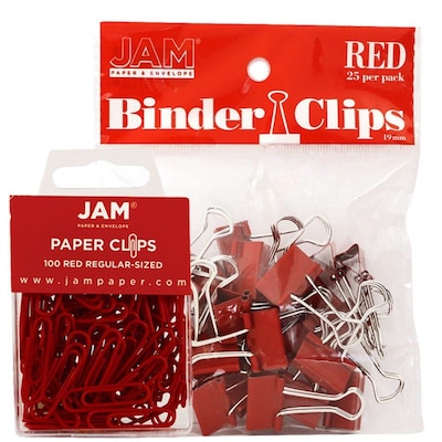 JAM Paper® Red Paper Clips & Blind Clips Office Desk Supply Bundle includes one pack of 100 regular sized paperclips and one bag of 25 small binder clips. Each paperclip is this bundle measures 28 millimeters and are made out of sturdy wire coated in smooth red plastic. The binder clips are made of shiny metal. The bodies of these clips feature a bold red color while the handles are a grey steel color. Each of these clips measures 19 millimeters. This bundle is excellent for organizing documents, memos, notes, and other papers in your office or work space! These items will help your organized papers to stand out with their bold red color.