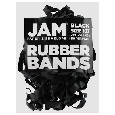 There is one color that will never go out of style no matter the year or the season. That color, of course, is black. JAM Paper® Black Rubber Bands are no exception to this fact. Whether you need them for your office, your home, or your office, these black rubber bands will help you stay tidy and organized while looking sharp! This pack contains a total of 50 rubber bands. Each one is size #107. Made out of durable and flexible rubber, these reliable rubber bands can be wrapped around piled of envelopes or files, closed boxes, groups of pencils, piles of brochures, bags that have been opened, and more to keep them together and secure.