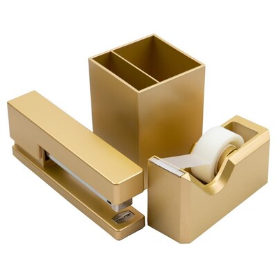 JAM Paper® Gold Desk Trio Pack will immediately liven up your desk and workspace! Replace your tired and dull-colored office supplies with this pack of colorful desk accessories that include a stapler, tape dispenser and pen holder. These colorful products will also appeal to college students when they're decorating their dormitories. Each item is durably-made from high quality hard plastic, has a smooth finish and contains a rubber base to help hold the item in place. The pen holder has two slots that provide you with plenty of room to store your pens, pencils and highlighters! Size: Stapler 1.125in x 2.5in x 6in; Tape Dispenser 1.75in x 2.5in x 4.5in; Pen Holder 3.875in x 2.75in x 2.75in| Color: Gold | Quantity: 4