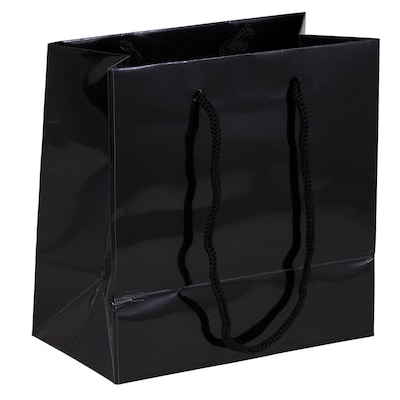 Tackle all your gift wrapping with JAM Paper Gift Bags with Rope Handles. The stylish, square build of these small Black glossy gift bags make them ideal for gifting friends and family gift cards, jewelry, money and more. Delicately crafted threaded rope handles provide strength, stability and style while 6 1/2" x 6 1/2" x 3 1/2" dimensions accommodate to small items with ease. These bags hold gifts and treats like gift cards, jewelry, goodies, party favors, and more. Address unique recipients with the matching gift tag attached to the front rope handle. Perfect for birthdays, weddings, anniversaries, baby showers, bridal showers, holidays, graduations, and everyday gifts! This packs contains 100 gift bags. Size: 6.5in x 6.5in x 3.5in | Color: Small Square | Quantity: 100/pack