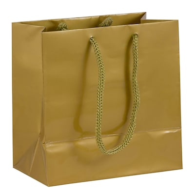 JAM Paper Small Square Glossy Gift Bags are the perfect way to wrap up the perfect gift. These bags are made from sturdy, 85lb paper, so you can be assured that they won't be ripping any time soon. They are gold and have a high-gloss, smooth finish and are complemented with a soft, rope handle and come with an attached blank gift tag. They measure 6 1/2 x 6 1/2 x 3 inches, so they are great for smaller gifts. Use any time you need to give a gift, from birthdays and Christmas to graduations and bridal showers. We've got you covered for any occasion you can think of! Bags are sold in packs of 3. Size: 6 1/2 x 6 1/2 x 3 inches | Color: Gold Glossy | Quantity: 3/Pack