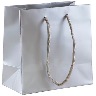 JAM Paper Glossy Square Gift Bags are just the bag you've always been looking for! Whether you need it for a birthday or a wedding, these square bags have a unique shape and are perfect to wrap smaller gifts. They are a small size, measuring 6 1/2 x 6 1/2 x 3 inches, are a beautiful silver color and have a high-gloss finish. They feature a soft, rope handle accompanied by a blank gift tag, so you can personalize a special message. These bags are sold in packs of 3. Size: 6 1/2 x 6 1/2 x 3 inches | Color: Silver Glossy | Quantity: 3/Pack