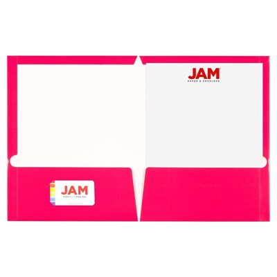 Is your world feeling black and white" Are you looking for a glimmer of excitement within a canvas of grey" Look no further! JAM Paper Hot Pink Glossy Two Pocket Presentation Folders feature a fun and vibrant color that is sure to stand out in any work space! These folders are made out of durable 100lb cardstock. Each one has two pockets on the inside on the right and left. The left-side pocket features a convenient business card slot. These folders have a smooth, glossy finish. This pack includes a total of 6 folders! Use them to organize documents, notes and more as you go to classes or go about your work.