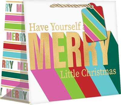 JAM PAPER Medium Design Bags measure 10" x 8" x 4". These bags feature a "Merry Little Christmas" design and are sold in a pack of 120. Perfect for any medium sized gifts this time of year. Use these for all your gifting needs this holiday!