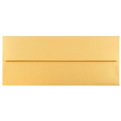 Wow recipients with JAM Paper® #10 Business Envelopes! We understand that staying professional is essential for businesses, so we created these one-of-a-kind envelopes just for you. With its gold metallic finish, you can be certain that your important letters and documents won't be overlooked or lost. This pack contains 50 Gold Stardream Metallic envelopes. Each envelope measures 4 1/8" x 9 1/2", has a booklet opening, straight flap, gum closure, is made from 32 lb. paper, and has a metallic finish.