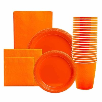 JAM Paper® Orange Party Supply Pack is a delightful tableware set that'll make any party room pop! If you're already planning to decorate your heart out, then make sure you don't forget to dress up the table, which is the center of every party. It's where your guests congregate, eat and drink after all! This pack features only disposable products, which make them easy to walk around with and handle. The products are 20 plastic small round appetizer/dessert plates, 20 plastic regular-sized round plates, 50 small beverage napkins, 50 regular-sized napkins, 20 plastic cups and 1 paper tablecloth. This assortment can serve a host of people, and it's perfect for any occasion!Color: Orange| Quantity: 6