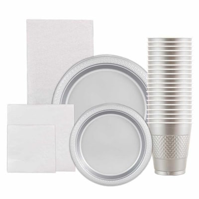 JAM Paper® Silver Party Supply Pack features shiny disposable tableware that'll make for a flashy display! If you're hosting a graduation party or 25th anniversary celebration, then this silver-colored set offers all the essentials you'll need to help ensure your event's a hit. This pack contains 20 plastic small round appetizer/dessert plates, 20 plastic regular-sized dinner plates, 50 small beverage napkins, 50 regular-sized napkins, 20 plastic cups and 1 tablecloth. The plates and cups may be thrown away after use for a quick cleanup, or washed and saved for future occasions! Guests are guaranteed to be served well and comfortably with this supply pack. Color: Silver| Quantity: 6