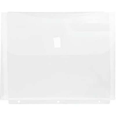 JAM Paper® Clear Letter Booklet Plastic Binder Envelopes with Hook & Loop Closure and 3 Hole Punch are 9.75 x 13inches in size and have a 1-inch expansion. Each one has 3 binder holes on its bottom spine that allows it to fit perfectly into a standard sized 3 ring binder. This pack includes 12 envelopes. Composed of thin and pliable, yet sturdy and protective plastic, these envelopes are ideal for standard sized documents that you want to store, keep safe, and easily carry around inside of a binder. They reliably guard your papers again tearing, bending, stains, and more. The certified Hook & Loop Closure of these envelopes ensure that they close tightly and can be opened easily. Their clear quality provides the added convenience of being able to view their contents from the outside.