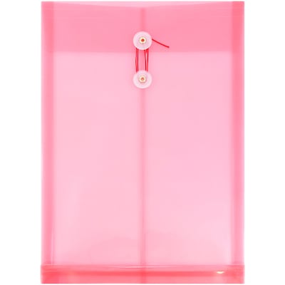 JAM Paper Red Legal Open End Plastic Envelope with Button and String Tie Closure are made of pliable, yet durable plastic and are sized to fir standard to large sized documents. Each one features a straight flap opening on the top end and a two button string tie closure to keep your documents secure. With a pale pink, semi-transparent surface, these envelopes allow you to store, carry, and organize your documents with a hint of color while still being able to view them from the outside. These envelopes are 9 3/4 x 14 1/2 inches in size. Protect your documents from getting scratched, bent, ripped, or lost in the messes of life with this 12 pack of colored envelopes!
