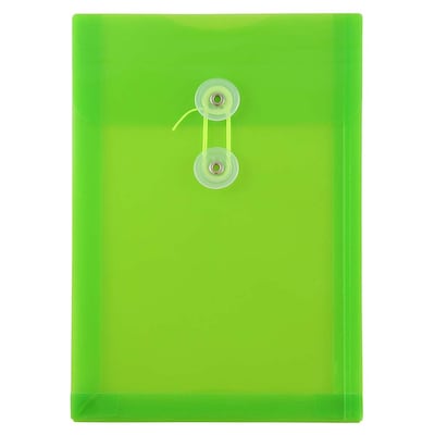 JAM Paper® Lime Green Medium Plastic Open End Envelopes with Button and String Closures are made of durable yet pliable plastic and each feature a secure two button string tie closure. As these envelopes are a little smaller than the standard sheet of paper (about 6 x 9 inches), they are perfect for smaller documents and checks. The bright electric green color of this envelope can help you stay organized by making your documents and other stored items stand out to be found quickly and easily! This pack includes 12 envelopes. Don't let your smaller, yet valuable documents get lost in the messes of life. Keep them protected and in order with these bright envelopes!