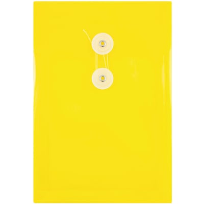JAM Paper Yellow Medium Plastic Open End Envelopes with Button and String Closures are made of durable yet pliable plastic and each feature a secure two button string tie closure. As these envelopes are a little smaller than the standard sheet of paper ( a little more than 6 x 9 inches) , they are perfect for smaller documents and checks. The sunny color of this envelope can help you stay organized by making your documents and other stored items stand out to be found quickly and easily! This pack includes 12 envelopes. Don't let your smaller, yet valuable documents get lost in the messes of life. Keep them protected and in order with these bright envelopes!