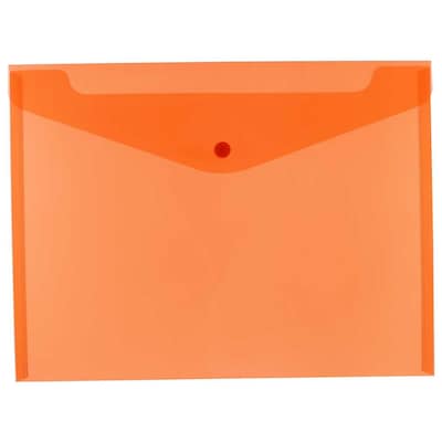 JAM Paper & Envelope's Letter Booklet Plastic Snap Closure Envelopes are designed to hold and carry standard size documents. Made from smooth semi-translucent plastic, these envelopes are water, scratch and tear resistant, constructed to safely secure a nd protect important documents from the elements. They measure 9 3/4 x 13 inches, fitting documents on their horizontal side, and include a Snap closure, intended to help seal and secure papers. The button snap easily pulls apart yet is secure enough to keep your documents neat, in place and organized. Their size also makes these envelopes very practical; they easily fit in most filing drawers, desk organizers, shelves, or in bags and briefcases if you need them while on the go. Great to use for organ izing papers, documents, memos, presentations, marketing materials and more. Easily fits standard documents (8.5 x 11 inches) and smaller items. Sold in packs of 12. This letter size booklet plastic envelope comes in the color Orange.
