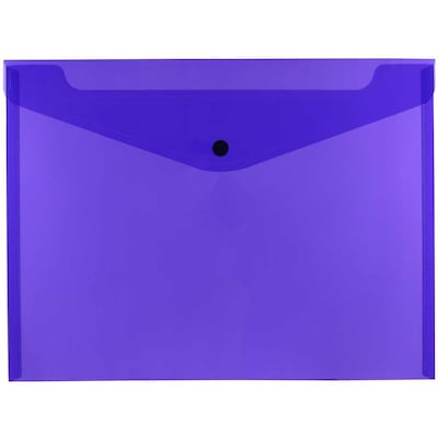 JAM Paper & Envelope's Letter Booklet Plastic Snap Closure Envelopes are designed to hold and carry standard size documents. Made from smooth semi-translucent plastic, these envelopes are water, scratch and tear resistant, constructed to safely secure a nd protect important documents from the elements. They measure 9 3/4 x 13 inches, fitting documents on their horizontal side, and include a Snap closure, intended to help seal and secure papers. The button snap easily pulls apart yet is secure enough to keep your documents neat, in place and organized. Their size also makes these envelopes very practical; they easily fit in most filing drawers, desk organizers, shelves, or in bags and briefcases if you need them while on the go. Great to use for organ izing papers, documents, memos, presentations, marketing materials and more. Easily fits standard documents (8.5 x 11 inches) and smaller items. Sold in packs of 12. This Letter size booklet plastic envelope comes in the color Purple.