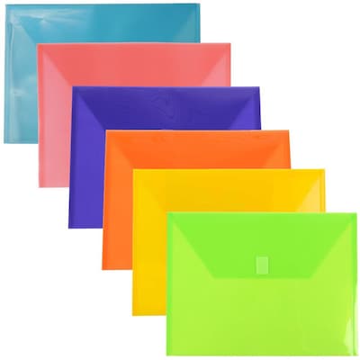JAM Paper® Plastic Letter Booklet Envelope Folders with Hook & Loop Closure are designed to hold and carry standard size documents. Made from smooth semi-translucent plastic, these envelopes are water, scratch, and tear resistant, constructed to safely secure and protect important documents from the elements. They measure 9.75 x 13 inches, fitting documents on their horizontal side, and include a Hook & Loop Tab closure, intended to help seal and secure papers. The Hook & Loop tab easily pulls apart yet is secure enough to keep your documents neat, in place and organized. Their size also makes these envelopes very practical; they easily fit in filing drawers, desk organizers, shelves, or in bags and briefcases if you need them while on the go. Great to use for organizing papers, memos, presentations, marketing materials and more. Easily fits standard 8.5 x 11-inch documents and smaller items. This assorted pack includes some of our most popular colors: Red, Green, Blue, Yellow, Orange, and Purple.