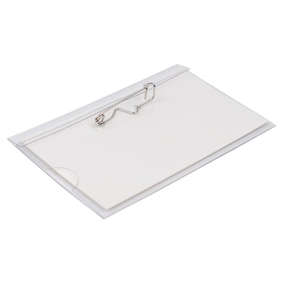 Hold badges, ID cards, and name cards with JAM Name Tags. Each clear, plastic name tag has a pocket to contain card inserts and small items. Features two side holes on either end of the top of the plastic tag. Packs include white string cords with metal fastener ends, plastic pouches, and perforated white cards. To use, simply slip your name card into the clear pocket and secure both holes with thread by twisting the metal fasteners. Our Clear Tags with Pins are great for attaching right to your lapel - super quick and easy to use. Quick assembly. Great for orientations, camps, job fairs, and more! Lightweight, durable, comfortable, and easily disposable, these nametags are perfect for groups of people to introduce themselves and get to know each other. Anyone can use these badge holders with ease, whether a factory worker, student, office worker, or other. Water-resistant and reusable. Name Tags measure 3 5/8 x 2 1/4 inches each, and are sold in packs of 96 badges.