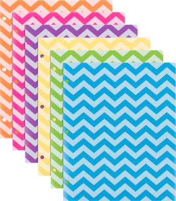 JAM Paper® Plastic 2 Pocket School POP Folders with 3 Hole Punch are your solution for easy organization this school year! Our Assorted Chevron Fashion Colors POP folders are made from durable poly plastic, preventing any stains or scratches from damaging your documents in style. Each 9 7/16" x 11 5/8" folder includes a business card slit, 2 deep pockets for extra storage, and feature a 3 hole punch design designed to fit into any standard size binder. These folders accommodate 8 1/2" x 11" papers, such as essays, presentations, forms, quizzes, handouts and more! From school to the office and home, our POP folders are suitable for all your needs! This pack contains 6 folders (Fuchsia, Orange, Yellow, Lime Green, Teal and Purple). Size: 9.5in x 11.5in | Color: Assorted Chevron Fashion Colors | Quantity: 6/pack