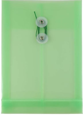 JAM Paper Green Medium Plastic Open End Envelopes with Button and String Closures are made of durable yet pliable plastic and each feature a secure two button string tie closure. As these envelopes are 6.25in x 9.25in, a little smaller than the standard sheet of paper, 6.25 x 9.25 in (just over 6 x 9 inches), they are perfect for smaller documents and checks. The aloe green color of this envelope can help you stay organized by making your documents and other stored items stand out to be found quickly and easily! This pack comes with 3 envelopes. Don't let your smaller, yet valuable documents get lost in the messes of life. Keep them protected and in order with these colored envelopes! Size: 6.25in x 9.25in (1.25 inch expansion) | Color: Green | Quantity: 3