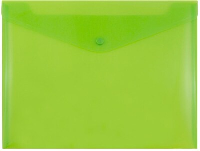 These JAM Paper Lime Green Letter Booklet Plastic Envelopes with Snap Closures are 9.75 x 13 inches in size and come in packs of 3. They are made of pliable, semi-transparent, brightly colored plastic and are perfect for storing or transporting standard sized documents. Each one has a Vflap opening and a one-button snap closure to keep your documents secure and in place. Use them at home, at your office, or any place in which you have need to become more organized. Get all of your important papers in order and make them easy to find! Their vivid green color is sure to bring a lively energy to any setting! Size: 9.75in x 13in | Color: Lime Green | Quantity: 3