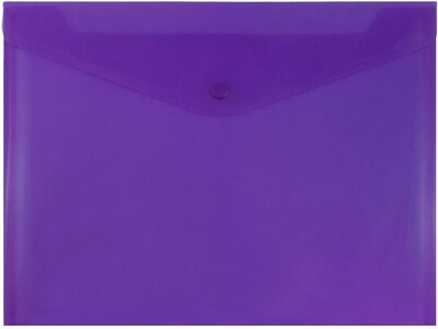 These JAM Paper Purple Letter Booklet Plastic Envelopes with Snap Closures are 9.75 x 13 inches in size and come in packs of 3. They are made of pliable, semi-transparent, brightly colored plastic and are perfect for storing or transporting standard sized documents. Each one has a Vflap opening and a one-button snap closure to keep your documents secure and in place. Use them at home, at your office, or any place in which you have need to become more organized. Get all of your important papers in order and make them easy to find! Their bold purple is sure to make your documents stand out while adding a bit of expression to your office supply collection. Size: 9.75in x 13in | Color: Purple | Quantity: 3