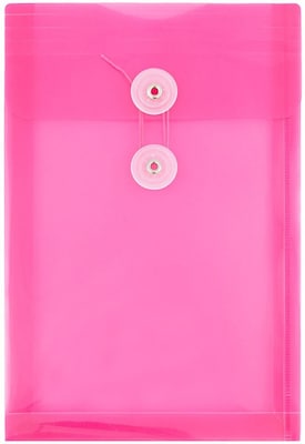 JAM Paper Fuchsia Medium Plastic Open End Envelopes with Button and String Closures are made of durable yet pliable plastic and each feature a secure two button string tie closure. As these envelopes are 6.25in x 9.25in, a little smaller than the standard sheet of paper, 6.25 x 9.25 in (just over 6 x 9 inches), they are perfect for smaller documents and checks. The vivid pinkish color of this envelope can help you stay organized by making your documents and other stored items stand out to be found quickly and easily! This pack includes 3 envelopes. Don't let your smaller, yet valuable documents get lost in the messes of life. Keep them protected and in order with these bright envelopes! Size: 6.25in x 9.25in (1.25 inch expansion) | Color: Fuchsia | Quantity: 3