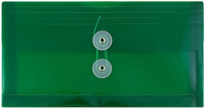 JAM Paper Green #10 Plastic Business Envelopes with Button and String Tie Closures are great for organizing, storing, and protecting your letters, receipts, checks, bank slips, and more! Each envelope is made if sturdy plastic has a straight flap opening and a two button, string tie closure. Each one measures 5.25in x 10in (about 5 x 10 inches) in size. Use them at the office to keep track of business purchases or at home to store letters or bills. Use them at lawn or bake sales to store cash! The durable composure and grass green color of these envelopes allows you to provide protection for you documents while helping them to stand out for easier organization and finding! Organize all of your smaller important documents with this pack of 3. Size: 5.25in x 10in | Color: Green| Quantity: 3