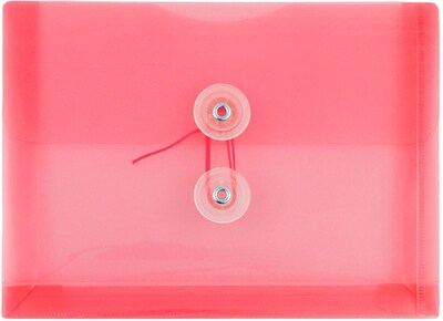 JAM Paper Pink Index Sized Plastic Booklet Envelopes with Button and String Tie Closures are 5.5 x 7.5 inches, the perfect size for 5" x 7" index cards! Use them to store and carry your notes for that upcoming exam, for recipes at home, or for any note card purpose! Each one is made of pliable, yet durable plastic, has a straight flap opening, and features a secure two button string tie closure. These envelopes are sure to keep all of your small documents and note cards neat, orderly, and safe from damage. This pack includes 3 envelopes. Don't let your important notes or smaller documents get lost in the messes of life. Keep them organized and easy to find with these grapefruit pink envelopes! Size: 5.5in x 7.5in | Color: Pink | Quantity: 3