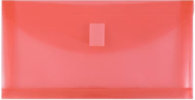 JAM Paper Red Hook and Loops Closure #10 Plastic Filing Envelopes measure 5.25 x 10 inches each and expand in width up to 1 inch. This pack contains an even total of 3 envelopes. Each one is made out of smooth and durable poly plastic and features a light strawberry red color! These envelopes have rounded flap openings and secure, easy-to-use hook and loop fastener closures. Use these red plastic envelopes to store, protect and organize receipts, checks, notes, cards, and other important papers and documents. They can also be used to enclose small office and school supplies such as scissors, pens, and pencils! Use them in the classroom, your work space, or at home. Size: 5.25in x 10in | Color: Red | Quantity: 3/ pack