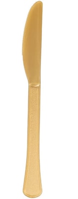 Add convenience and color to your next event with JAM Paper® Assorted Cutlery Party Pack of Premium Utensils Plastic Knives! Made from high-quality, durable plastic these Gold knives help make your clean up easier so you can enjoy spending more time relaxing. At the end of a busy day, the last thing anyone wants to do is wash dishes. These disposable knives only require one step: throwing them away! They are also washable if you wish to reuse for an upcoming event. Their Gold finish adds a touch of color and luxury to your table and meal and are great at matching your event's theme. Whether you are using these knives for a birthday, graduation party, office lunch or dinner at home, you'll be saving time and energy. Couple them with our matching napkins, plates, forks, and table covers to complete your cutlery set! This pack contains 48 Gold knives.Size: 8in | Color: Gold | Quantity: 48/pack