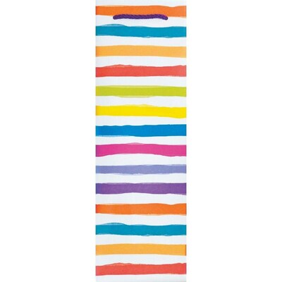 JAM PAPER Wine Design Bags measure 4 3/4" x 13 7/8" x 3 7/8". These bags feature a "Rainbow Stripes" design and are sold in a pack of 3. Use this wine bottle bags for all your gifting needs. Perfect size to fit any bottle of wine.