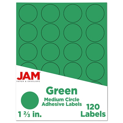 Jam® 1 1/2" Circle label sticker seals in green color is designed easily peel and stick for convenient usage. Label is printer friendly and compatible with templates in Microsoft Word, sold as 120 labels.