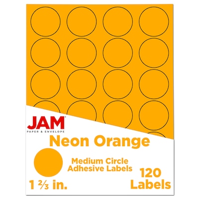 JAM Paper Round Label Sticker Seals, 1 2/3" Diameter, Neon Orange, 24 Labels/Sheet, 5 Sheets/Pack (354329580)