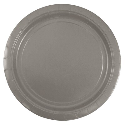 JAM Paper® Medium Round Paper Party Plates are the perfect addition for family gatherings. From family dinners to life celebrations, these Silver paper plates cater to it all! Serve breakfast, lunch, dinner, and everything in between on these plates made from sturdy, premium cardstock with a smooth food safe finish. Leaks, tears, and spills have nothing on our plates! Not only are these silver plates the perfect color for graduation parties, bridal showers, and birthdays, but they also cut clean up time in half. Just use and throw away, no sink required! However you decide to use, expect high quality performance. This pack contains 50 medium silver recyclable paper plates measuring 9" diameter.