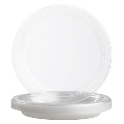 Medium Round Plastic Plates (Clear) by JAM Paper® are an ideal option for parties. This durable and disposable tableware is made of plastic and comes in a pack of 20.