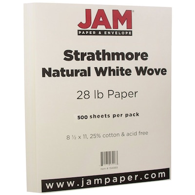 JAM Paper® Strathmore 28lb paper comes with ream of 500 sheets in natural white wove color which is made out of 25% cotton are perfect for any invites and available in 24lb paper and 80lb cover.