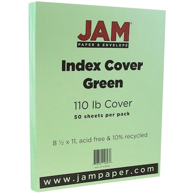 JAM Paper® Green vellum bristol index cardstock cover measuring 8 1/2" x 11" has a paper weight of 110 lbs and is sold as 50 per pack.