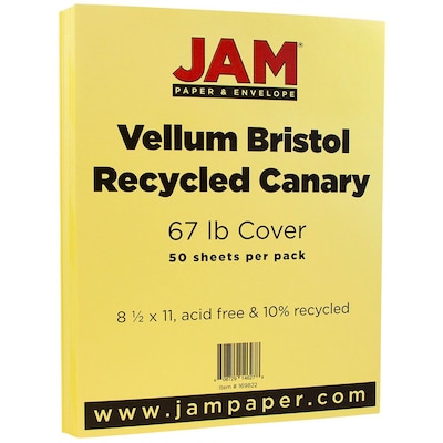 JAM Paper® Canary vellum Bristol cardstock cover measuring 8 1/2" x 11" has a paper weight of 67 lbs. and is sold as 50 per pack.