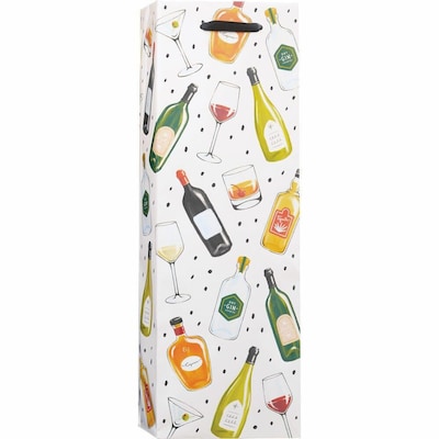 JAM PAPER Wine Design Bags measure 4 3/4" x 13 7/8" x 3 7/8". These bags feature a "Wine Bottles and Glasses" design and are sold in packs of 3. Use these wine bottle bags for all your gifting needs. Perfect size to fit any bottle of wine.