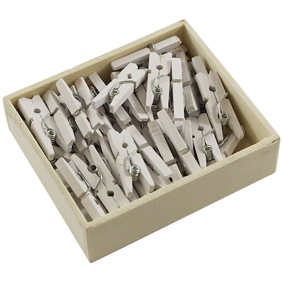 JAM Paper® Small White Wood Clothing Pin Clips are sold in wooden boxes of 50! Each pin measures 7/8 of an inch and is made of wood with a metal spring mechanism. These clothing style pins are painted with a clean tone of white paint. Versatile and lightweight, these pins are great for fastening photos, memos, receipts, cash, note cards, place cards, and other small items to surfaces or string. Providing a light amount of pressure, there clips and be easily removed and reattached. Use these pins in your home or office! They are ideal for many crafts, organization projects, decorations, attached notes to party favors, and much more!