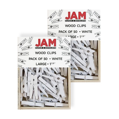 JAM Paper® Medium White Wood Clothing Pin Clips are sold in wooden boxes of 50! Each pin measures 1 1/8 inches and is made of wood with a metal spring mechanism. These clothing style pins are painted with a clean and modern shade of paint! Versatile and lightweight, these pins are great for fastening photos, memos, receipts, cash, small pieces of fabric, and other small items to surfaces or string. Providing a light amount of pressure, there clips and be easily removed and reattached. Use these pins in your home or office! They are ideal for many crafts, organization projects, decorations, attached notes to party favors, and much more!