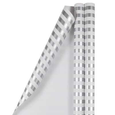 Wrap your gifts in love with JAM Paper® Jumbo Silver & White Stripe Wrapping Paper Rolls. From little to large presents, your gifts wrapped in our stunning silver & white striped wrapping paper will get friends and family anticipating to find out what's inside! This 25 square foot roll has you covered for various occasions — from weddings, baby showers, birthdays, anniversaries, bridal showers and more. This wrapping paper also doubles as a fun backdrop for photoshoots, scrapbooking, crafts and more! No matter the occasion or use, our wrapping paper promises superior quality and efficiency! Rolls sold in packs of 2 Size: 25 sq. ft. | Color: Silver & White Stripe | Quantity: 2