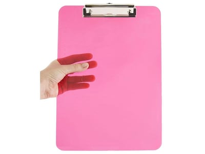 Fill out forms, reports and other documents away from the office with this plastic clipboard. The translucent pink design offers a fun look, while the durable metal clip secures paper in place. Rounded corners and lightweight construction make this portable writing surface comfortable to carry. Crafted from sturdy plastic, this JAM Paper pink clipboard stands up to everyday use.