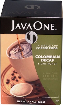 Java One Single cup Colombian ground Coffee is filled in 0.3 oz. pod and is de-caffeinated to prevent health risks. Light roast Coffee delivers high-quality smooth and rich taste and used to brew a 8 - 10 oz. cup of beverage, sold as 14 pods per box.