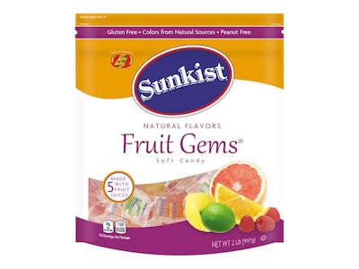 Keep your sweet tooth satisfied with a pouch of Jelly Belly Sunkist Fruit Gems. The large 2-pound bag, colors from natural sources and five juicy flavors make individually wrapped Jelly Belly Sunkist Fruit Gems a tasty treat that can be shared.
