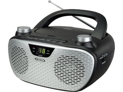 Experience great sound and portable convenience with the Jensen CD-485 CD player with AM/FM stereo receiver. This stylish portable player has a carrying handle, so it's ready to go with you wherever you go. Play music from a CD, AM/FM radio, or connect a digital audio player to the auxiliary input jack and play it right through the CD-485 speakers. This modern boom box also has a bright and bold green LED display that shows what the CD track is playing. The stereo headphone jack allows you to listen to music in private without bothering others around you.