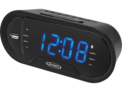 The Jensen JCR-298 Bluetooth digital AM/FM dual alarm clock radio with USB charging port is a sleek, compact, and multifunctional device for your nightstand. The unit features Bluetooth connectivity and front-mounted 2.1A USB port that's great for charging your smartphone while you sleep. The unit also includes an easy-to-read 1.2" blue LED display with dimmer control, dual alarms with wake to radio, Bluetooth or alarm, sleep and snooze functions, a digital AM/FM receiver with 10 AM and 10 FM presets, and an auxiliary input jack. The unit operates on 120VAC power and has a battery back-up feature for saving your time settings in the event of a power outage (two AAA batteries not included).