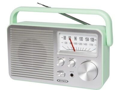 Never miss your favorite game, listening to your favorite radio station, or catching up on the latest news with the Jensen MR-750 portable AM/FM radio. The radio can go anywhere you go and is available in stylish colors with a large analog tuning dial that makes setting your favorite station a breeze. You can also play music from an MP3 or other digital media player using the front-mounted auxiliary input jack. The MR-750 also includes a built-in speaker, a folding handle, and an FM telescopic antenna. The unit operates on 120VAC power or using four C batteries (not included).