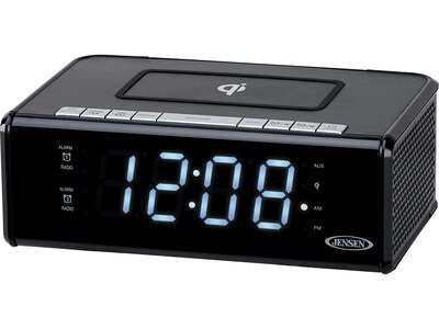 The Jensen QiCR-200 digital dual alarm clock radio offers a compact design and convenient charging features that can be used on a nightstand or around your home or office. The unit features two ways to charge your smartphone, wirelessly or using a cord. You can also charge your smartphone using a charging cable (not included) and the 2.1A USB port mounted on the back of the unit. Also, it features two separate alarms that let you wake to the alarm or radio and a digital AM/FM receiver. The large 1.2" white LED display is easy to see from across the room and compliments the overall design. Other features include a dimmer control, sleep and snooze function, and digital volume control. The unit operates on 120VAC power and has a battery backup feature for saving your time settings in case of a power outage.