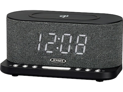 The Jensen QICR-50 digital dual alarm clock radio offers a sleek compact design with two ways to charge your smartphone. Many smartphones feature wireless charging, and the QICR-50 includes a top-mounted Qi wireless charging pad along with a 1 amp USB charging port for handling all your charging needs. Also, it features two separate alarms that let you wake to the alarm or to your favorite FM radio station. The large 1.2" white LED display sits behind the cloth front panel and is large enough to be seen from across the room. Other features include a dimmer control, sleep and snooze function, and auxiliary input jack. The unit operates on 120VAC power and has a battery backup feature for saving your time settings in case of a power outage.