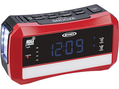 Jensen Wireless Digital AM/FM Alarm Clock Radio with NOAA Weather Alert, Emergency Light, and Built-in Flashlight, Red/Black